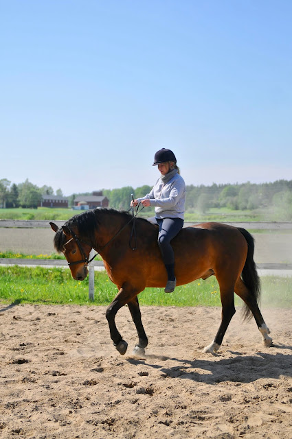Kuvat on muuten tältä keväältä, viimeisimmältä ratsastukselta noin kuukausi takaperin. Clancylla on ollut nyt niin paljon kipukohtauksia että en ole raaskinut sitä juurikaan rasittaa. Työnteko ei kuitenkaan vaikuta kipuiluihin, niitä ei tule enempää vaikka se tekisi töitä. Ja miten se niitä töitä tekeekään, tällä ratsastuskerralla pienellä maiskutuksella raviin sai lisää liikettä! Ei tietoakaan stoppailusta.